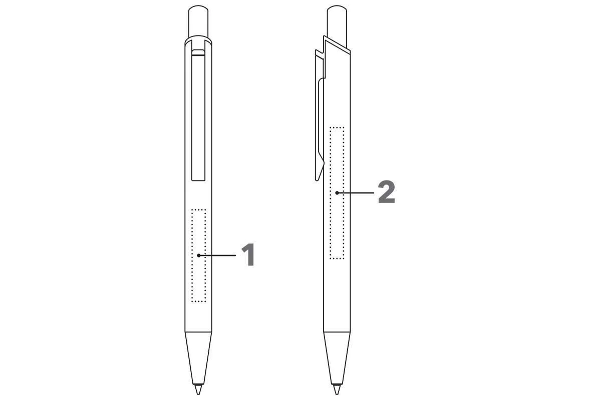 The pen has a metal clip, push-button and tip, and comes with a blue refill fitted.