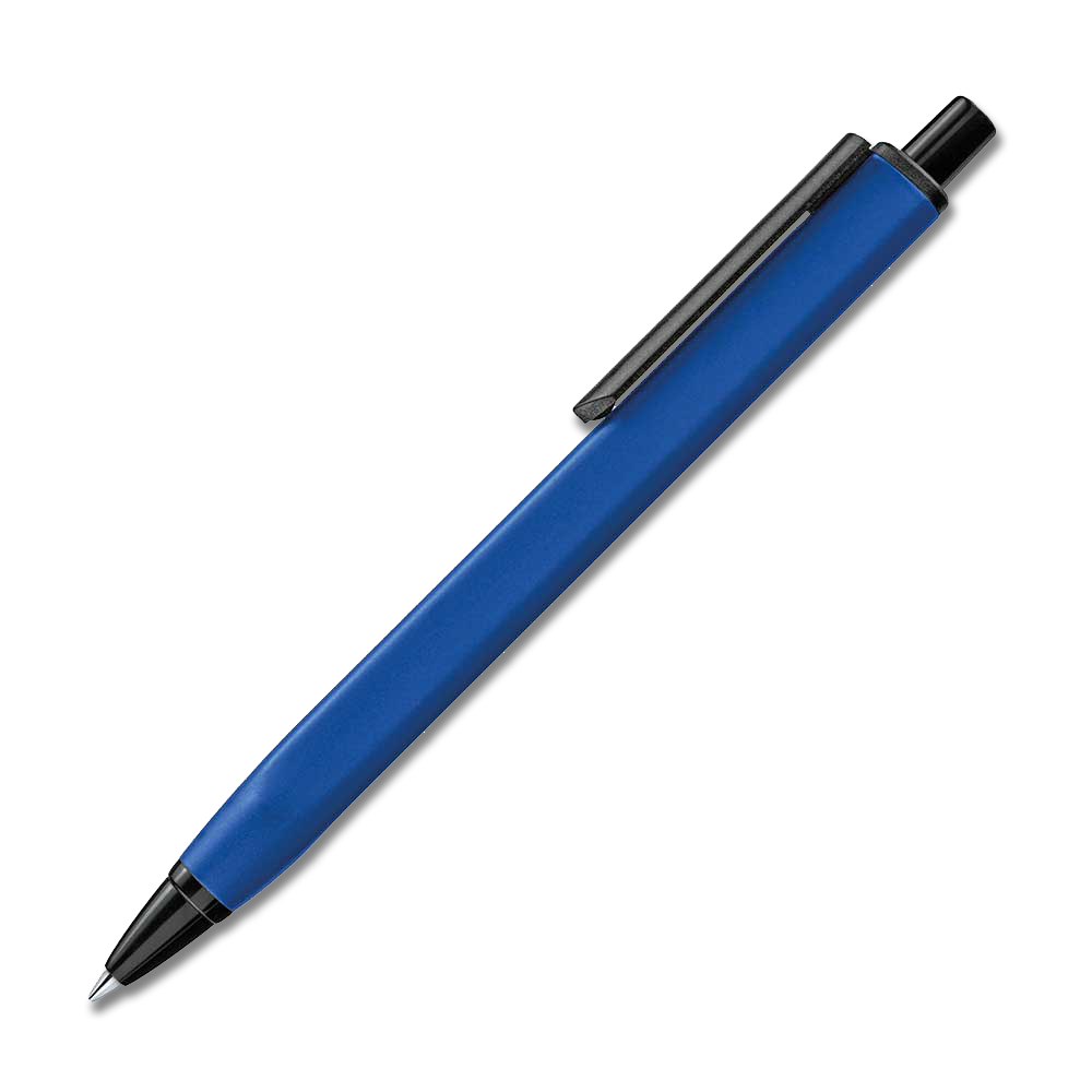 The pen has a metal clip, push-button and tip, and comes with a blue or black refill fitted.